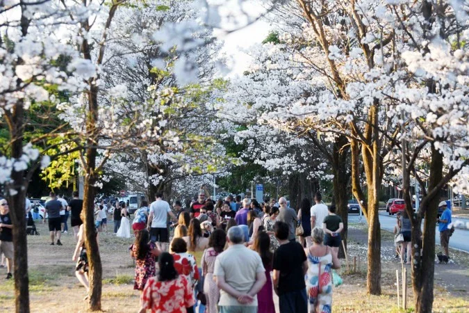 O clima era de contemplação e afeto. Casais caminhavam de mãos dadas, trocando beijos sob as árvores e capturando selfies para eternizar a beleza que dura apenas alguns dias. Para alguns, era a primeira vez diante da cena. Aline Couto, 40, saiu do Guará apenas para ver de perto o que denominou de “flocos de neve do Cerrado”. “Como floresceram ontem, eu vim hoje pra garantir. Mas já tem bastante no chão. Eu gosto muito de tirar fotos e o ipê-branco é perfeito como fundo, deixa qualquer registro mais especial”, disse.