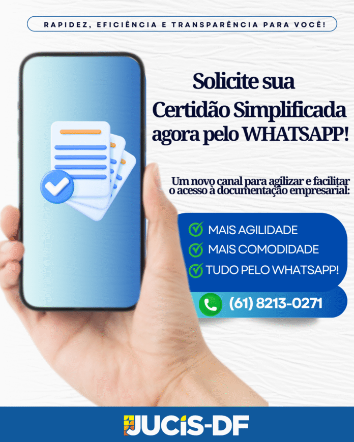 Para solicitar a certidão, basta entrar em contato pelo WhatsApp oficial da JUCIS-DF, através do número (61) 8213-0271, e seguir as orientações