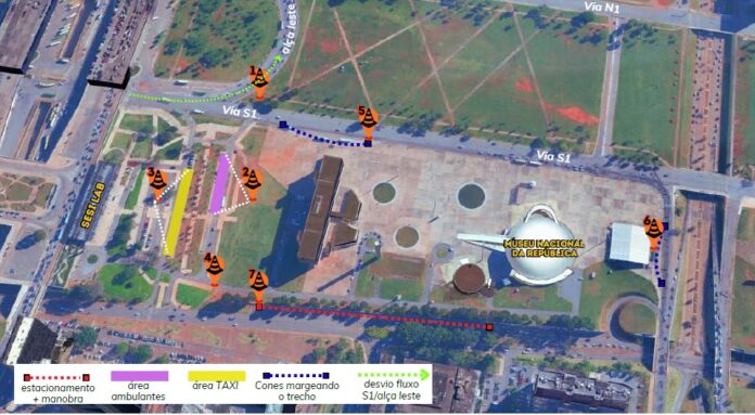 Nas vias entre o Museu Nacional e o Sesi Lab serão sinalizadas áreas para vendedores ambulantes e estacionamento para táxi. Os agentes também sinalizarão dos pontos de embarque e desembarque de passageiros próximos ao Museu. Na via S2, será delimitado um espaço para estacionamento e manobra. Durante o evento, o fluxo da via S1 será desviado para a alça leste da Rodoviária.