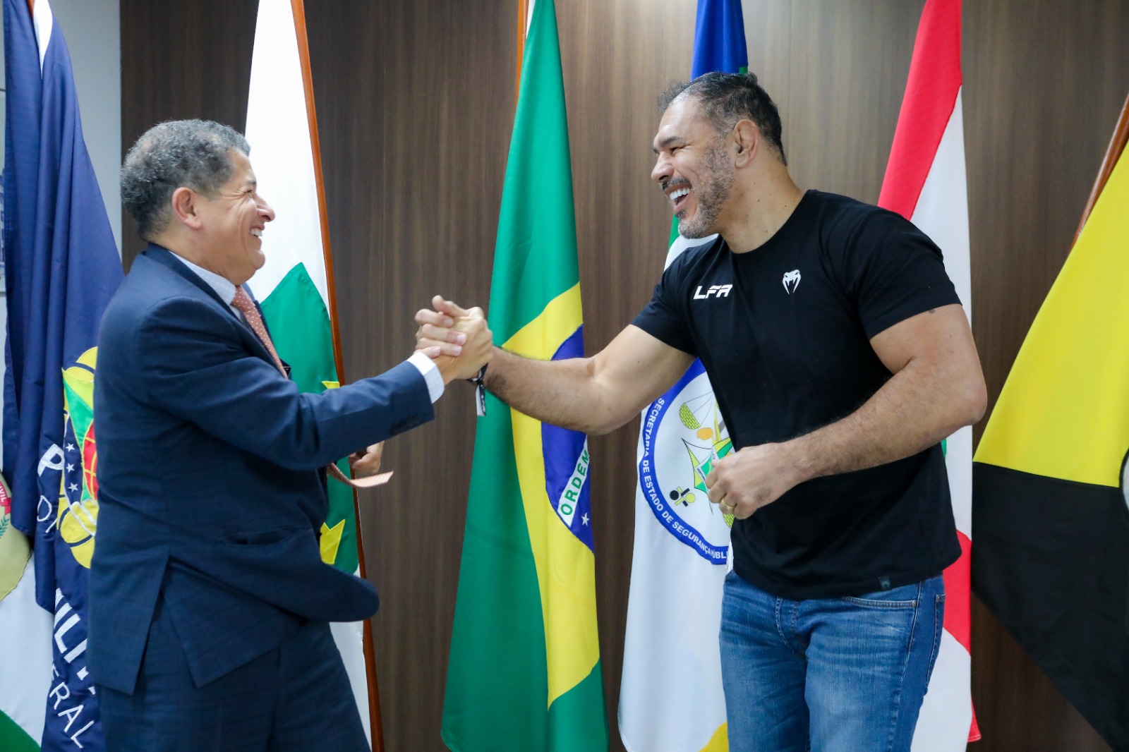 Minotouro falou sobre o impacto do incentivo ao esporte e o valor do investimento público nessa área — especialmente no contexto da segurança pública: “Fico muito feliz com a visita à Secretaria de Segurança Pública aqui em Brasília e mais ainda em saber que tem um investimento aqui nessa parte do esporte. Esporte como parte da educação, como parte psicológica, é muito importante para todo mundo, em especial para quem atua na segurança pública, que está ali no combate, no dia a dia”.