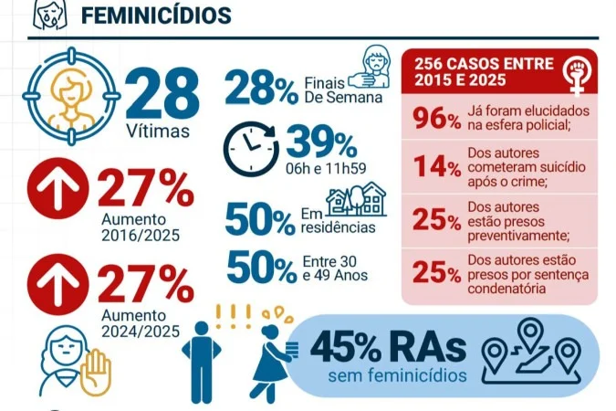 Em nota, o secretário de Segurança Pública, Sandro Avelar, destacou que o aumento observado evidencia a importância de ações integradas entre a segurança pública, justiça criminal e demais áreas do governo. “Seguimos ampliando a rede de prevenção e atendimento, com monitoramento contínuo dos riscos e responsabilização imediata dos autores desses crimes. Nossa meta continua sendo zero casos de feminicídio no Distrito Federal”, ressaltou.